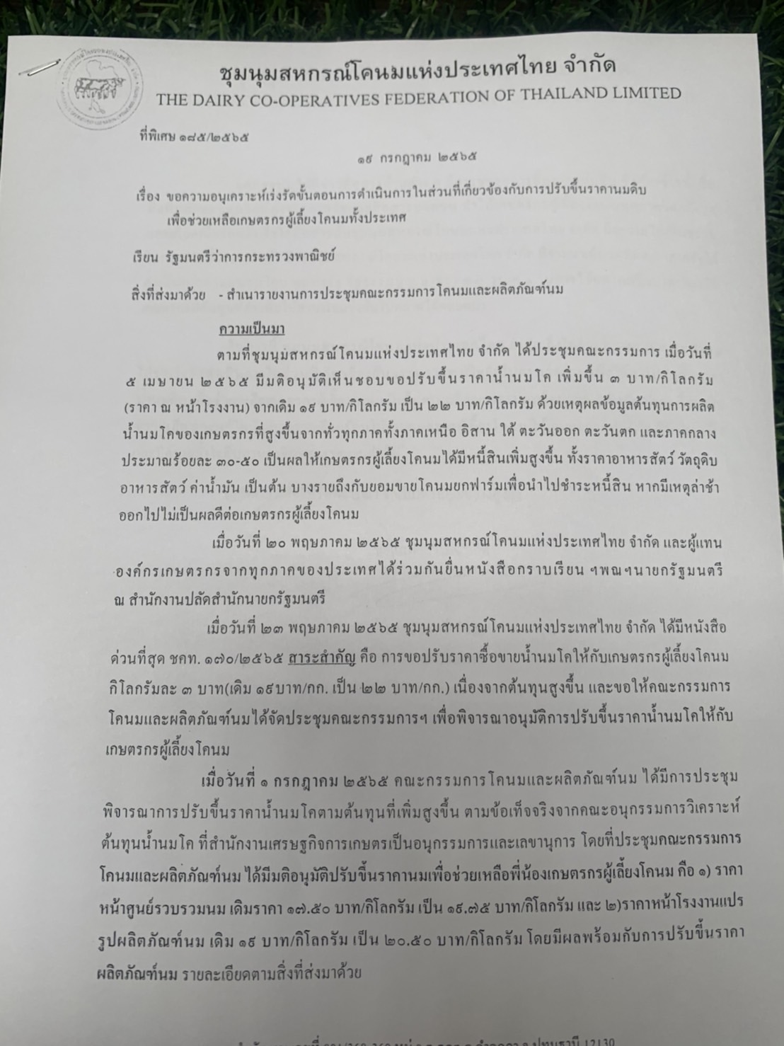 วันที่ 20 กรกฎาคม 2565 นายวัฒนศักย์ เสือเอี่ยม อธิบดีกรมการค้าภายใน รับหนังสือจากนายนัยฤทธิ์ จำเล ชุมนุมสหกรณ์โคนมแห่งประเทศไทย จำกัด พร้อมสมาชิก ที่ขอความอนุเคราะห์ให้เร่งรัดขั้นตอนในการปรับขึ้นราคาน้ำนมดิบกิโลกรัมละ 2.25 บาท เพื่อช่วยเหลือเกษตรกรผู้เลี้ยงโคนมทั่วประเทศที่ประสบปัญหาต้นทุนการผลิตสูงขึ้นมากกว่า 30% ในช่วง 4 เดือนที่ผ่านมา