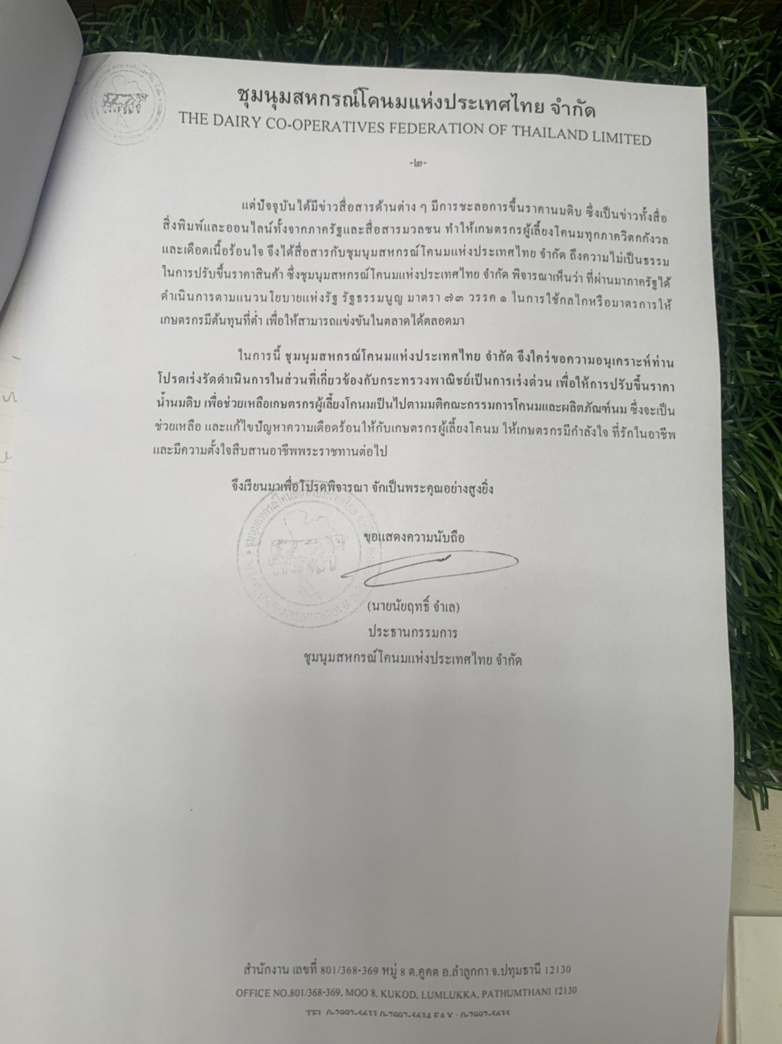ชุมนุมสหกรณ์โคนมแห่งประเทศไทยยกทัพยื่นหนังสือถึง “รัฐมนตรีพาณิชย์” ผ่านกรมการค้าภายในขอปรับขึ้นราคาน้ำนมดิบอีกกิโลละ 2.25 บาท/กก. อุ้มเกษตรกร 18,000 ครัวเรือน ต้นทุนพุ่ง 30% กรมการค้าภายในกัดฟันตรึงราคา ชี้หาก ครม.ไฟเขียวปรับ พร้อมให้ขยับราคาตามต้นทุนแต่ละราย มั่นใจปมโฟร์โมสต์เลิกนมพาสเจอไรซ์ แค่ปรับโมเดลธุรกิจชั่วคราว