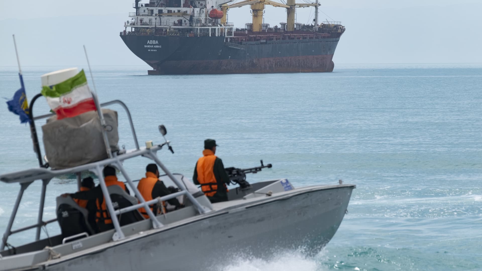 เรือเร็วของกองกำลังพิทักษ์การปฏิวัติอิสลาม (IRGC) แล่นไปตามอ่าวเปอร์เซียใกล้กับเรือบรรทุกสินค้า