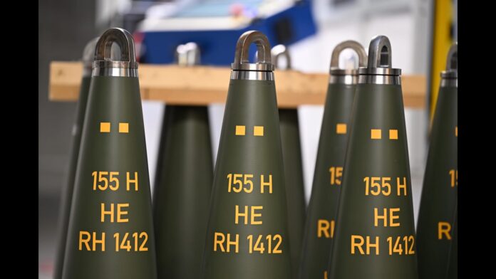 กระสุนปืนใหญ่ขนาดลำกล้อง 155 มิลลิเมตร และระยะ 40 กิโลเมตร ในโรงงาน Rheinmetall Rheinmetall เป็นผู้ผลิตระเบิดขนาด 155 มิลลิเมตรรายใหญ่ที่สุดในโลกตะวันตก