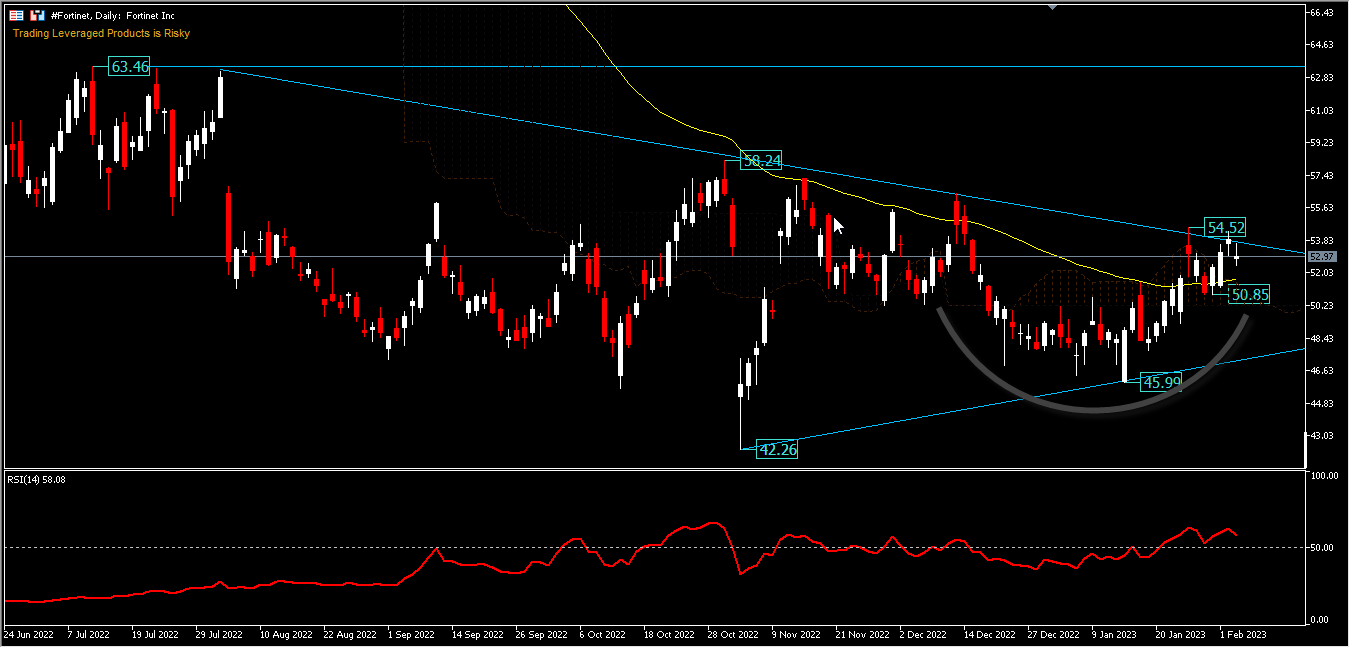 #ฟอร์ติเน็ตD1 – ราคาหุ้นสัปดาห์ที่แล้วปิดที่ $52.97 และตลอดเดือนมกราคม 2023 จนถึงปิดวันศุกร์ที่ผ่านมา มีกำไรสะสมประมาณ +15% กราฟรายวันแสดงรูปแบบ Cup ที่มีแนวต้านทันทีที่เห็นที่ $54.52 และราคาปัจจุบันอยู่เหนือ EMA 52 วันโดยมีแนวรับเล็กน้อยที่ $50.85. Fortinet ดำเนินการแบ่งราคาหุ้นในเดือนมิถุนายน 2565 และตั้งแต่นั้นราคาก็ขยับลงต่อไปเพื่อหาจุดต่ำสุดที่ $42.26 ในเดือนพฤศจิกายน 2565 อย่างไรก็ตาม ราคาหุ้นดีดตัวขึ้นจากจุดต่ำสุดเป็นกำไรมากกว่า 25%