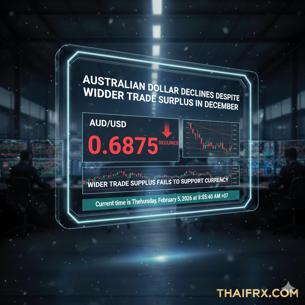 ข้อมูลล่าสุด ณ วันที่ 5 กุมภาพันธ์ 2026 ระบุถึงสภาวะที่น่าสนใจของค่าเงินดอลลาร์ออสเตรเลีย (AUD) ซึ่งปรับตัวลดลงแม้จะมีการประกาศตัวเลขดุลการค้าที่เกินดุลเพิ่มขึ้นเป็น 3,373 ล้าน AUD ในเดือนธันวาคมครับ