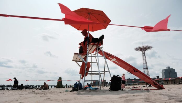 เจ้าหน้าที่รักษาความปลอดภัยทำงานอยู่ที่ชายหาดเกาะโคนีย์เมื่อวันที่ 15 มิถุนายน พ.ศ. 2566 ในเขตบรูคลิน ในนครนิวยอร์ก