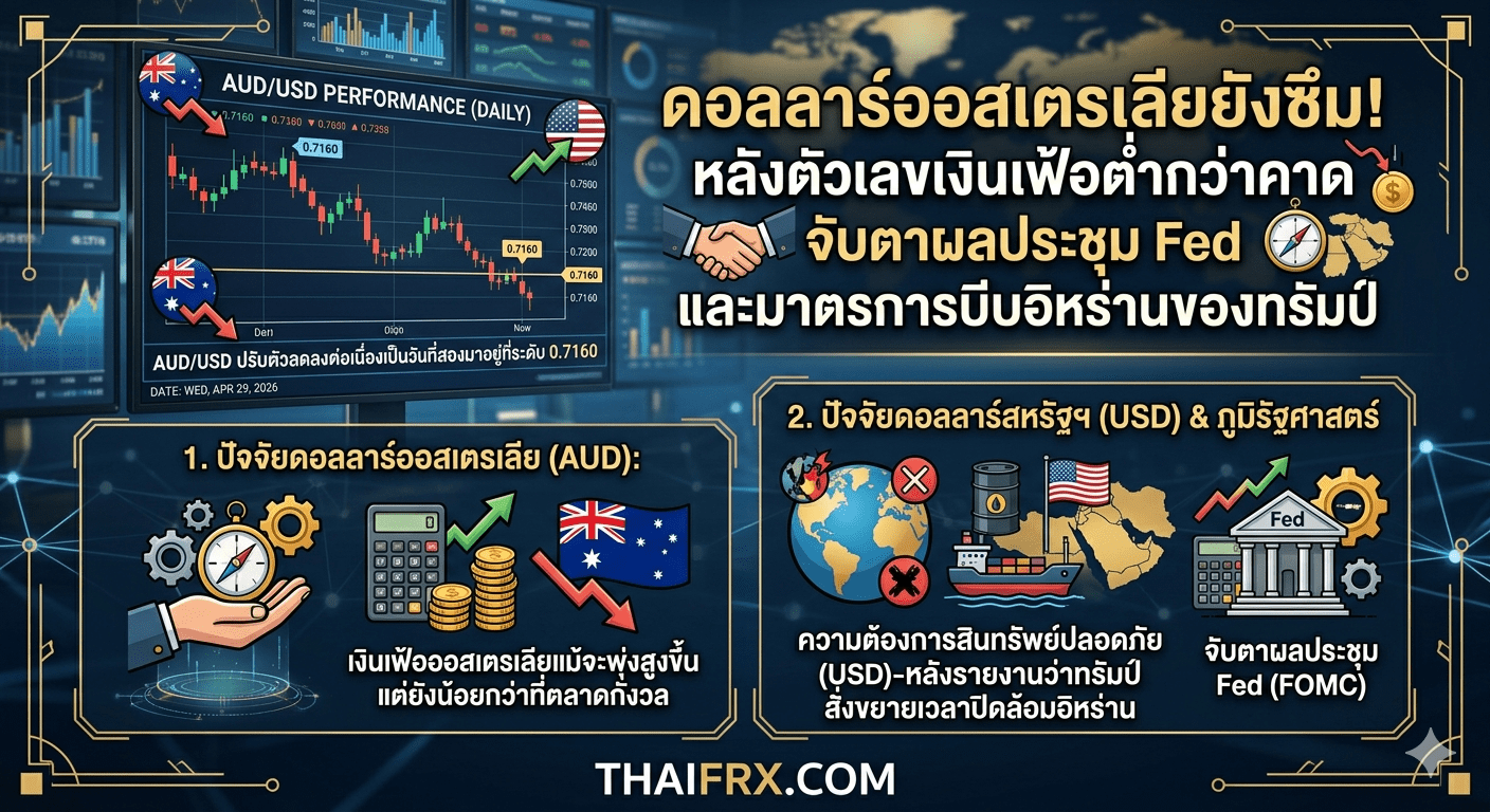 “ดอลลาร์ออสเตรเลียยังซึม! หลังตัวเลขเงินเฟ้อต่ำกว่าคาด จับตาผลประชุม Fed และมาตรการบีบอิหร่านของทรัมป์” คู่เงิน AUD/USD ปรับตัวลดลงต่อเนื่องเป็นวันที่สองมาอยู่ที่ระดับ 0.7160 เนื่องจากเงินดอลลาร์สหรัฐฯ แข็งค่าขึ้นจากความต้องการสินทรัพย์ปลอดภัย หลังมีรายงานว่าทรัมป์สั่งขยายเวลาปิดล้อมอิหร่าน ขณะที่เงินเฟ้อออสเตรเลียแม้จะพุ่งสูงขึ้นแต่ยังน้อยกว่าที่ตลาดกังวล