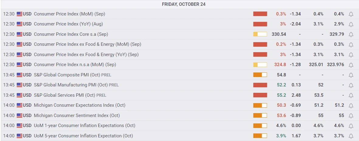 อัตราเงินเฟ้อ CPI ทั่วไปอยู่ที่ 3.0% YoY ในเดือนกันยายน ซึ่งต่ำกว่าที่คาดไว้ที่ 3.1% เพียงเล็กน้อย และทำให้นักลงทุนต้องดิ้นรนเพื่อซื้อสินทรัพย์เสี่ยงจากการคาดการณ์ว่าขณะนี้ Fed ถูกล็อคในการปรับลดอัตราดอกเบี้ยสองจุดในไตรมาสภายในสิ้นปีนี้ ตัวชี้วัด CPI ของสหรัฐในวงกว้างต่ำกว่าที่คาดการณ์ไว้ และตลาดต่างมองข้ามข้อเท็จจริงที่ว่าการอ่านค่าเงินเฟ้อส่วนใหญ่ยังคงดำเนินการได้ดีกว่าคำสั่งของ Fed ที่ 2%