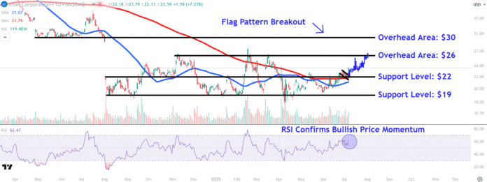 หลังจากการเรียกคืนค่าเฉลี่ยเคลื่อนที่ 200 วัน (MA) เมื่อเดือนที่แล้ว Intel หุ้นได้กลับไปสู่ตัวบ่งชี้ที่จับตามองอย่างใกล้ชิดภายในธงซึ่งเป็นรูปแบบแผนภูมิที่ส่งสัญญาณความต่อเนื่องของการเคลื่อนไหวล่าสุดของหุ้นที่สูงขึ้นจากพื้นของช่วงการซื้อขายหลายเดือน