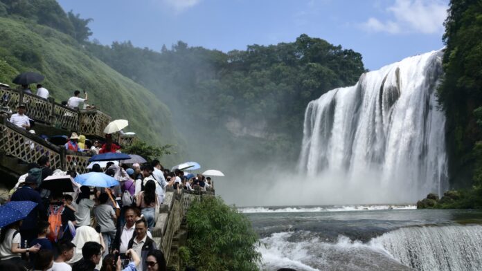 นักท่องเที่ยวเยี่ยมชมน้ำตก Huangguoshu ของชื่อเสียง “Monkey King” ในจังหวัด Guizhou ของจีนเมื่อวันที่ 5 ตุลาคม 2025 ในช่วงวันหยุดของนักขัตฤกษ์ตลอดทั้งสัปดาห์
