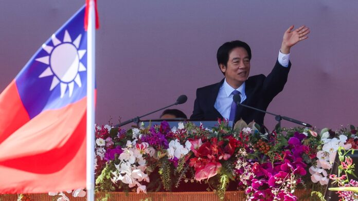 ไทเป, ไต้หวัน – 10 ตุลาคม: ประธานาธิบดีไล จิงเต้ (วิลเลียม ไล) ของไต้หวันกล่าวปราศรัยวันชาติในระหว่างพิธีวันชาติ ที่นอกสำนักงานประธานาธิบดีในกรุงไทเป ประเทศไต้หวัน เมื่อวันที่ 10 ตุลาคม 2568