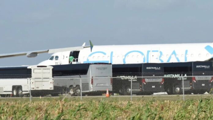 บุคคลหนึ่งบอร์ดเครื่องบินใน Harlingen, Texas Sunday, 31 สิงหาคม 2025 เนื่องจากรถบัสเช่าเหมาลำสี่คันถูกดึงเข้าไปในด้านข้างของสนามบินเพื่อขนผู้โดยสารหลายสิบคน