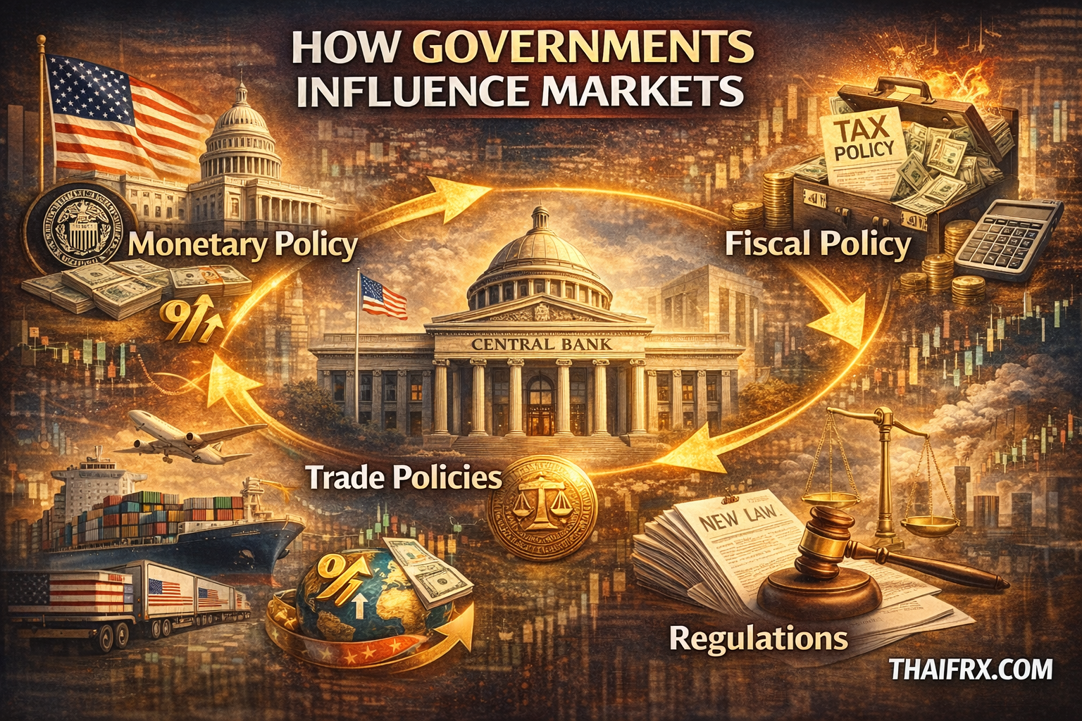 รัฐบาลมีบทบาทอย่างสำคัญในโลกการเงิน พวกเขาสามารถออกสกุลเงิน ปรับอัตราดอกเบี้ย และให้เงินช่วยเหลือ นอกจากนี้ยังกำหนดกฎระเบียบ เงินอุดหนุน และภาษี มาตรการทั้งหมดนี้สามารถส่งผลกระทบทั้งในทันทีและระยะยาวต่อบริษัท อุตสาหกรรม และตลาดโดยรวม