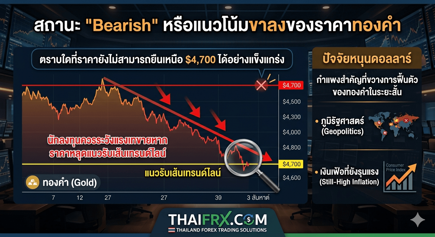 ภาพรวมตลาดทองคำในขณะนี้ตกอยู่ในสภาวะ “Bearish” หรือมีแนวโน้มขาลงมากขึ้น ตราบใดที่ราคายังไม่สามารถยืนเหนือ $4,700 ได้อย่างแข็งแกร่ง นักลงทุนควรระวังแรงเทขายหากราคาหลุดแนวรับเส้นเทรนด์ไลน์ เนื่องจากปัจจัยหนุนดอลลาร์จากทั้งเรื่องภูมิรัฐศาสตร์และเงินเฟ้อที่ยังรุนแรง เป็นกำแพงสำคัญที่ขวางการฟื้นตัวของทองคำในระยะสั้น