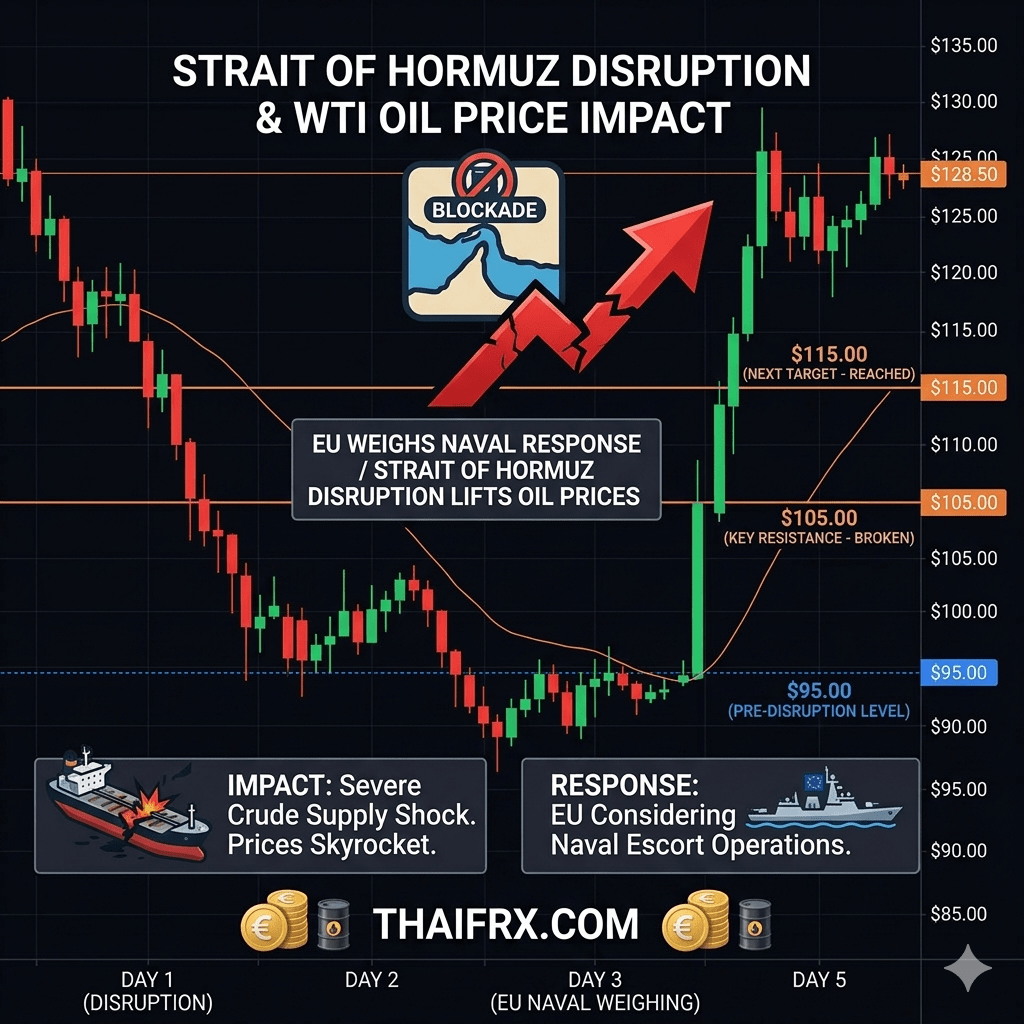 • Brent & WTI Surge: ราคาน้ำมันดิบ Brent พุ่งเหนือ $103 ต่อบาร์เรล ขณะที่ WTI เคลื่อนไหวรุนแรงเหนือ $96 โดยนักวิเคราะห์เตือนว่าหากการปิดช่องแคบยืดเยื้อ ราคาอาจพุ่งทะลุ $130 – $150 ได้ในระยะสั้น