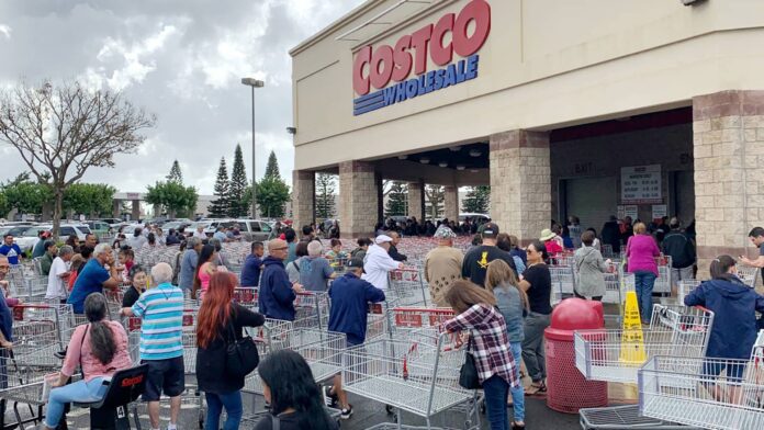 ผู้ซื้อเข้าแถวนอก Costco เพื่อซื้อเสบียงหลังจากกรมอนามัยของฮาวายเมื่อวันพุธแนะนำผู้อยู่อาศัยว่าควรตุนอาหาร น้ำ และสิ่งจำเป็นอื่น ๆ สำหรับ 14 วันสำหรับความเสี่ยงที่อาจเกิดขึ้นจากไวรัสโคโรนาสายพันธุ์ใหม่ในโฮโนลูลู ฮาวาย สหรัฐอเมริกา กุมภาพันธ์ 28, 2020.