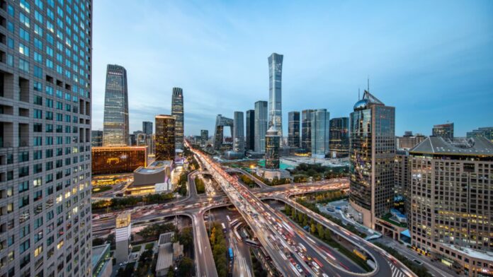 มุมมองทางอากาศของยานพาหนะที่ขับเคลื่อนอยู่บนถนนผ่านย่านธุรกิจกลางในกรุงปักกิ่ง ประเทศจีน