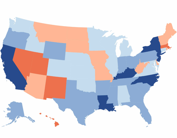 อีกด้านหนึ่งของรายการ รัฐที่มีอัตราสูงสุด 5 รัฐในปัจจุบัน ได้แก่ ฮาวาย เนวาดา แมสซาชูเซตส์ ยูทาห์ และนิวเม็กซิโก ทั้งหมดนี้อยู่ระหว่าง 6.57% ถึง 6.60%