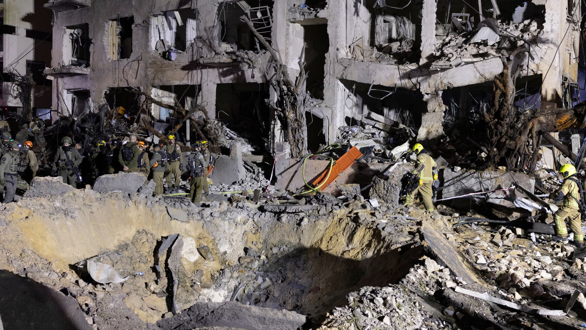 กองกำลังกู้ภัยปฏิบัติการที่อาคารที่ถูกโจมตีด้วยขีปนาวุธของอิหร่านในเมืองเทลอาวีฟ ประเทศอิสราเอล เมื่อวันอาทิตย์ที่ 1 มีนาคม 2026