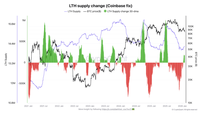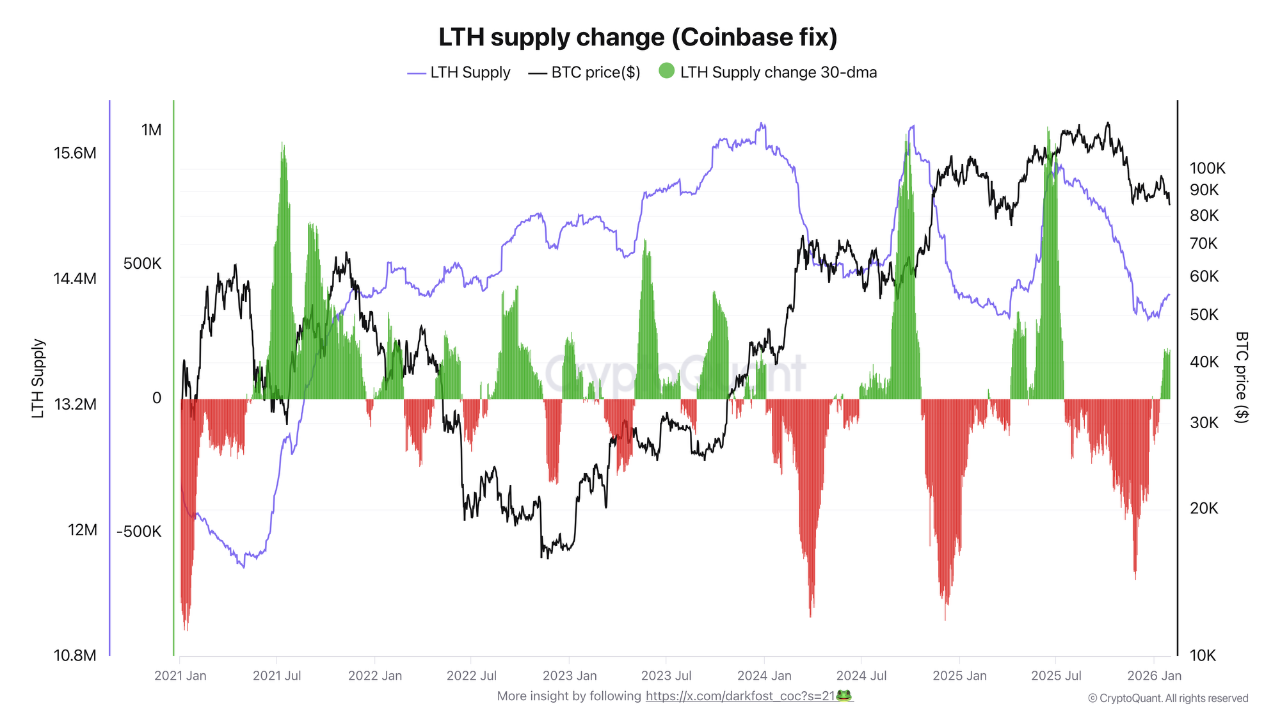 นักวิเคราะห์ออนไลน์ที่ใช้นามแฝง Darkfost เพิ่งเข้าสู่ CryptoQuant ผ่านทางโพสต์ Quicktake โดยชี้ให้เห็นว่าผู้ถือ Bitcoin ระยะยาวกำลังดึง BTC มากขึ้น ตัวบ่งชี้ที่เกี่ยวข้องที่นี่คือการเปลี่ยนแปลงอุปทาน LTH (การแก้ไข Coinbase)