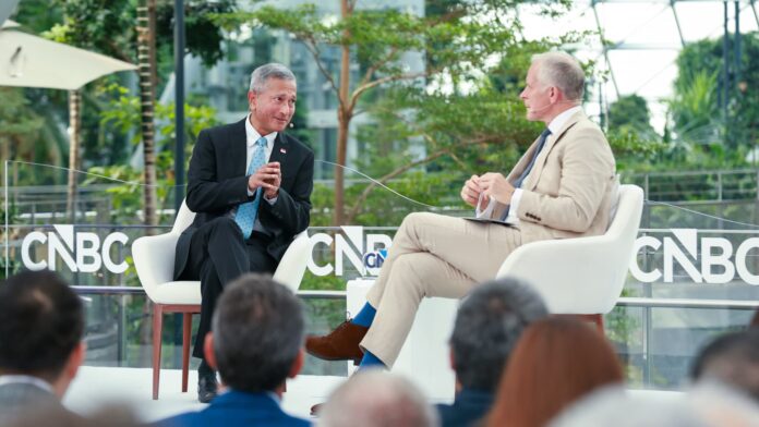 Balakrishnan กล่าวสุนทรพจน์ที่งาน CONVERGE LIVE ของ CNBC ในสิงคโปร์ โดยตอบคำถามที่ว่านครรัฐกำลังเผชิญกับแรงกดดันจากวอชิงตันและปักกิ่งให้เลือกระหว่างทั้งสองหรือไม่