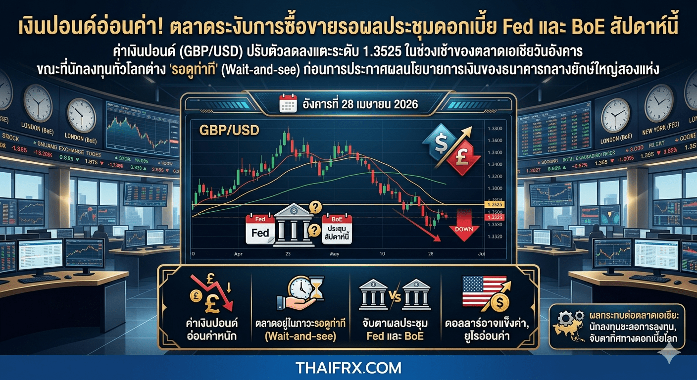 “เงินปอนด์อ่อนค่า! ตลาดระงับการซื้อขายรอผลประชุมดอกเบี้ย Fed และ BoE สัปดาห์นี้” ค่าเงินปอนด์ (GBP/USD) ปรับตัวลดลงแตะระดับ 1.3525 ในช่วงเช้าของตลาดเอเชียวันอังคาร ขณะที่นักลงทุนทั่วโลกต่าง “รอดูท่าที” (Wait-and-see) ก่อนการประกาศผลนโยบายการเงินของธนาคารกลางยักษ์ใหญ่สองแห่ง