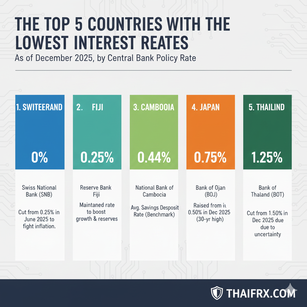ณ เดือนธันวาคม 2025 ประเทศที่มีอัตราดอกเบี้ยต่ำที่สุด 5 อันดับแรก ได้แก่: