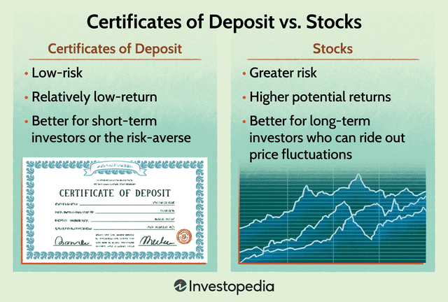 ซีดีจะให้ผลตอบแทนที่ดีที่สุดที่ใกล้เคียงกับอัตราเงินเฟ้อ หุ้นสามารถเพิ่มขึ้นทวีคูณความมั่งคั่งของคุณ หรือพวกเขาสามารถดิ่งลงไปได้ สำหรับเรื่องนั้น บริษัท ที่ออกพวกเขาสามารถออกไปทำธุรกิจทำให้หุ้นของพวกเขาไร้ค่า