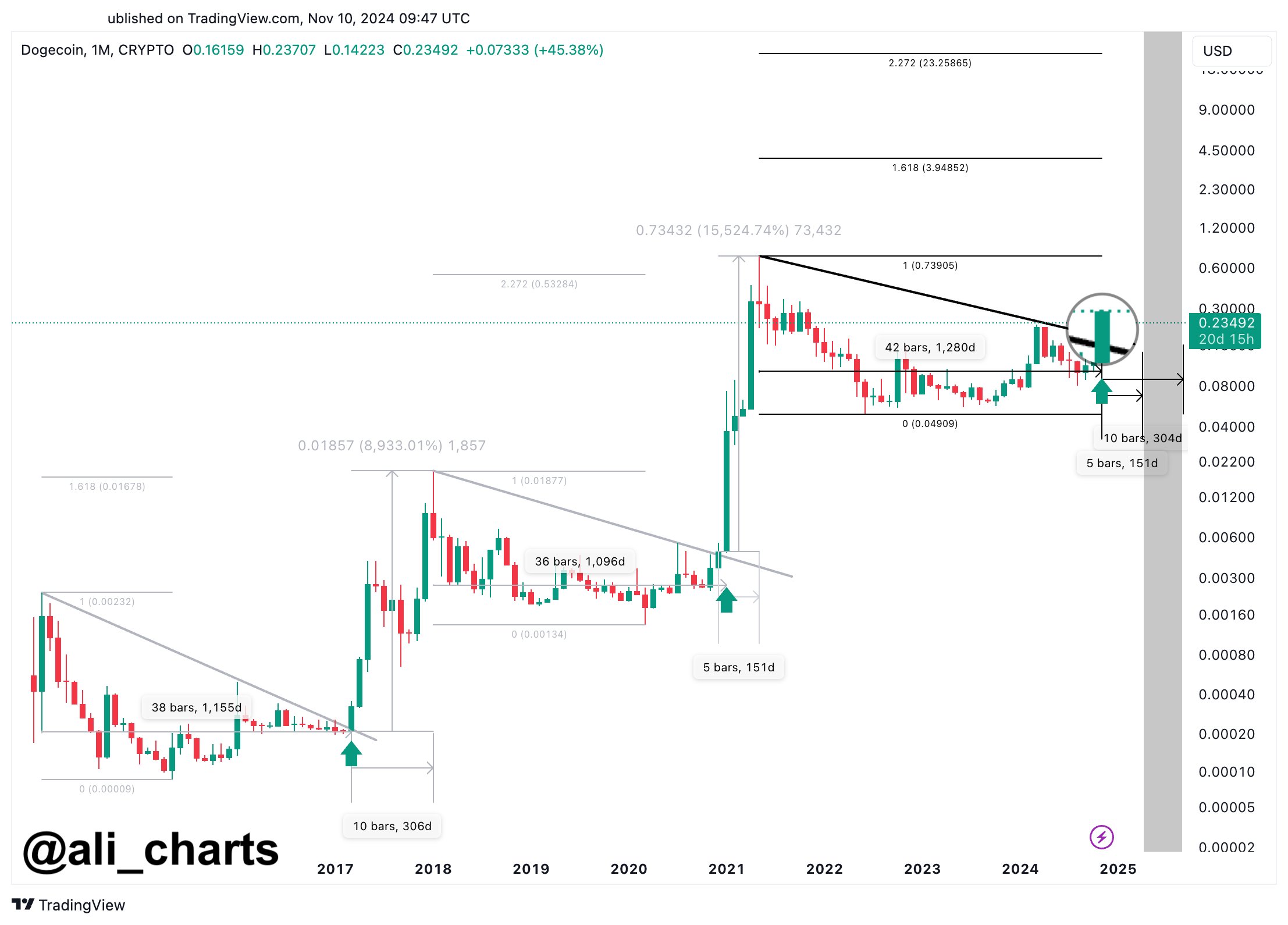 ในโพสต์ใหม่บน X นักวิเคราะห์ Ali Martinez ได้พูดคุยกันว่า Dogecoin จะไปในทิศทางใดต่อไปตามรูปแบบที่สังเกตได้ในช่วงตลาดกระทิงครั้งก่อน