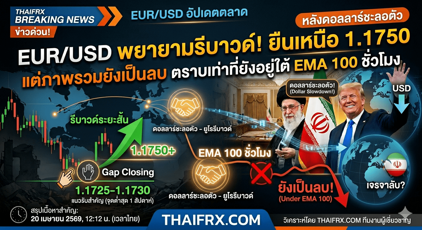 การฟื้นตัวระยะสั้น: EUR/USD เริ่มมีแรงซื้อกลับเข้ามาบริเวณแนวรับ 1.1725-1.1730 (จุดต่ำสุดในรอบ 1 สัปดาห์) และสามารถปิดช่องว่างราคา (Gap) ที่เปิดลงเมื่อเช้าไปได้เกือบทั้งหมด โดยปัจจุบันซื้อขายอยู่เหนือระดับ 1.1750