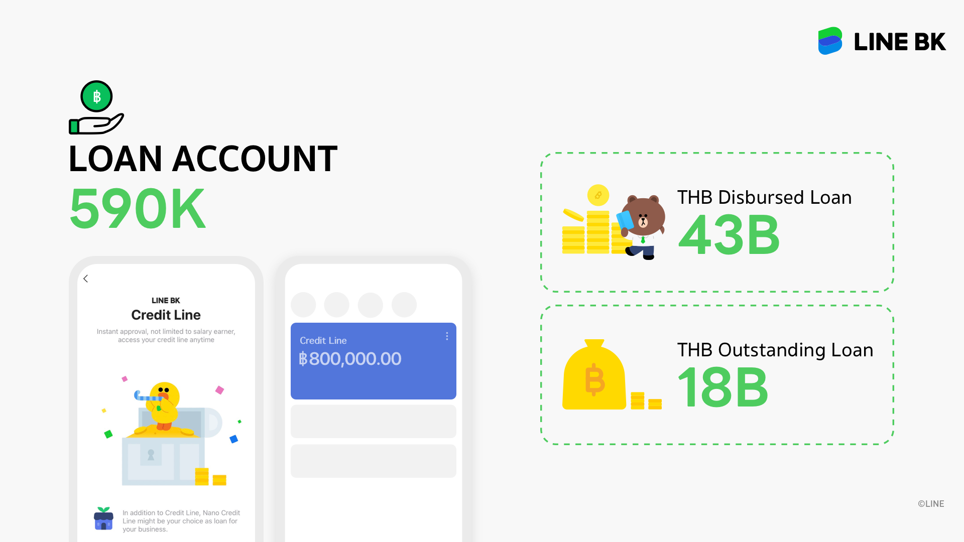 -ด้านบริการยืมเงินจาก LINE BK ทั้ง 2 ประเภท ได้แก่ บริการวงเงินให้ยืมและวงเงินให้ยืมนาโน ปัจจุบันมีลูกค้าใช้บริการกว่า 5.9 แสนบัญชี เติบโตขึ้น 81% เมื่อเปรียบเทียบปีต่อปี ยอดสินเชื่อคงค้างกว่า 18,000 ล้านบาท และมียอดการปล่อยสินเชื่อรวมตั้งแต่เปิดให้บริการมากกว่า 43,000 ล้านบาท