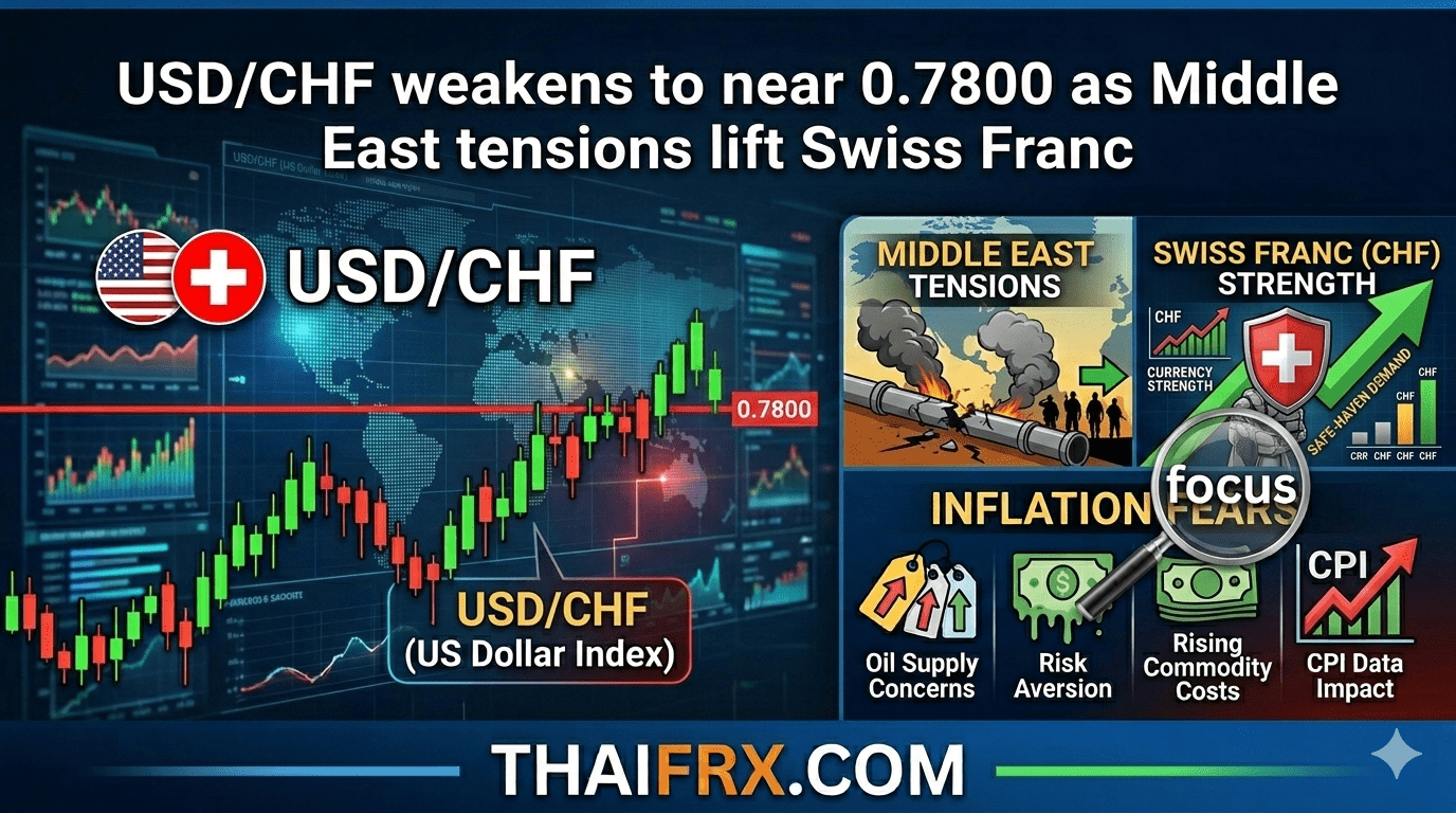 คู่เงิน USD/CHF ปรับตัวลดลงในช่วงเช้าวันนี้ (4 มีนาคม 2026) โดยลงมาเคลื่อนไหวใกล้ระดับ 0.7800 เนื่องจากนักลงทุนพากันเข้าถือครองเงินฟรังก์สวิส (Swiss Franc) ในฐานะสินทรัพย์ปลอดภัย (Safe-haven) ท่ามกลางสถานการณ์สงครามในตะวันออกกลางที่ยังคงตึงเครียดครับ