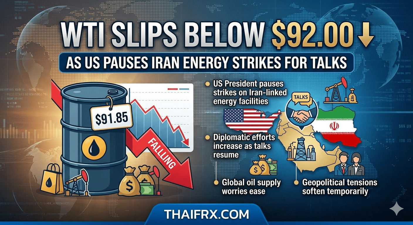 ราคาน้ำมันย่อตัว: ราคาน้ำมันดิบ West Texas Intermediate (WTI) ปรับตัวลดลงมาเทรดแถวระดับ $91.80 ต่อบาร์เรลในช่วงเช้าวันศุกร์ หลังจากประธานาธิบดีโดนัลด์ ทรัมป์ ประกาศระงับการโจมตีโครงสร้างพื้นฐานด้านพลังงานของอิหร่านออกไปอีก 10 วัน (จนถึง 6 เมษายน)